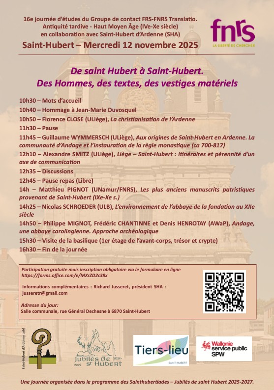 "De saint Hubert à Saint-Hubert. Des Hommes, des textes, des vestiges matériels" is de zestiende studiedag van de FRS-FNRS Contactgroep Translatio. Late oudheid – Vroege Middeleeuwen (4de-10de eeuw)